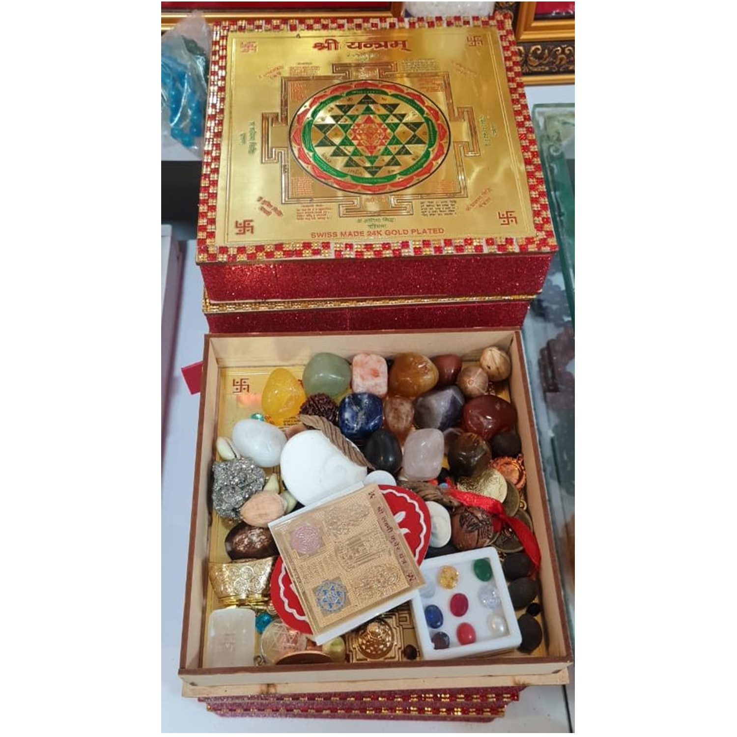 This special Complete Manjusha Box Diwali Pooja Kit with Shri Yantra Box comes in a big Shri Yantra Box. This Kit should be kept in your temple, Locker, Brahamsthan or office table after performing Laxmi Ganesha Pujan. This kit with box is believed to attract money, solve health issue because of negative energies, protection from evil eyes and black magic, increasing Knowledge and concentration.