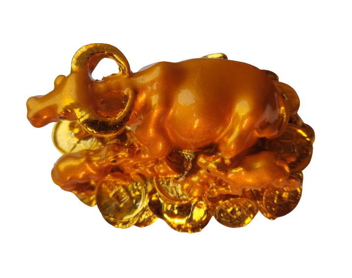 This feng shui Wish-fulfilling cow is believed as a symbol of wealth, prosperity, growth, and fertility. This feng shui wealth cow is made of resin with high-quality golden paint which is highly durable. This feng shui cow is sitting on Chinese coins and ingots with two calves which makes this symbol very special because Chinese coins and ingots are popular feng shui symbols for wealth, luck, and prosperity.