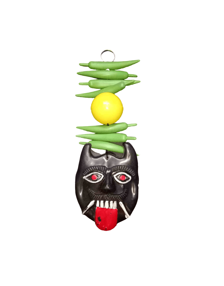 Nazar Battu symbol with Nimbu and Mirch is a traditional Indian method for keeping the bad effects of evil eyes away from house, workplace, or factory. It is hanged on the top front of the house, factory, or workplace for strong protection against evil eyes and negative energies.