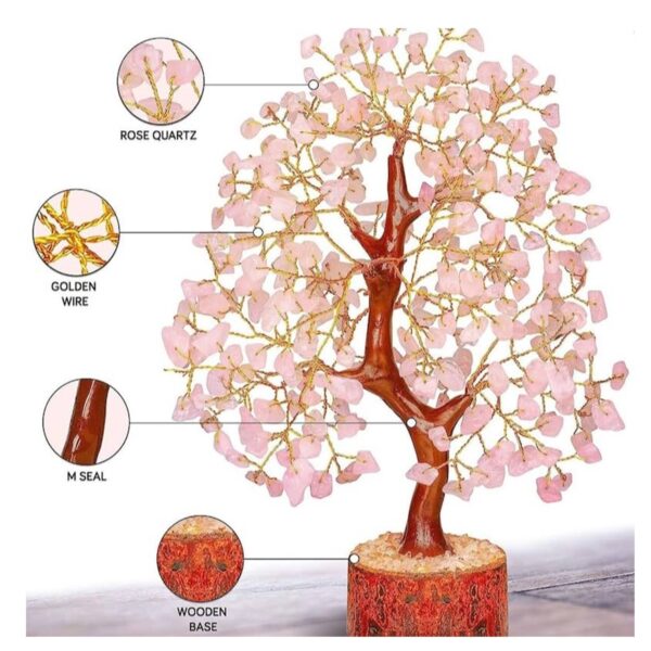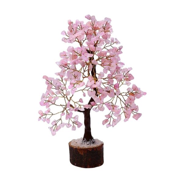 A Rose Quartz Crystal Tree is an intricately handcrafted gemstone tree made by attaching genuine rose quartz crystal chips to wire branches. These branches are often mounted on a base made of wood, gemstone, or resin. The tree is symbolic of life, growth, and prosperity, while the rose quartz enhances emotional balance, love, and heart chakra healing.