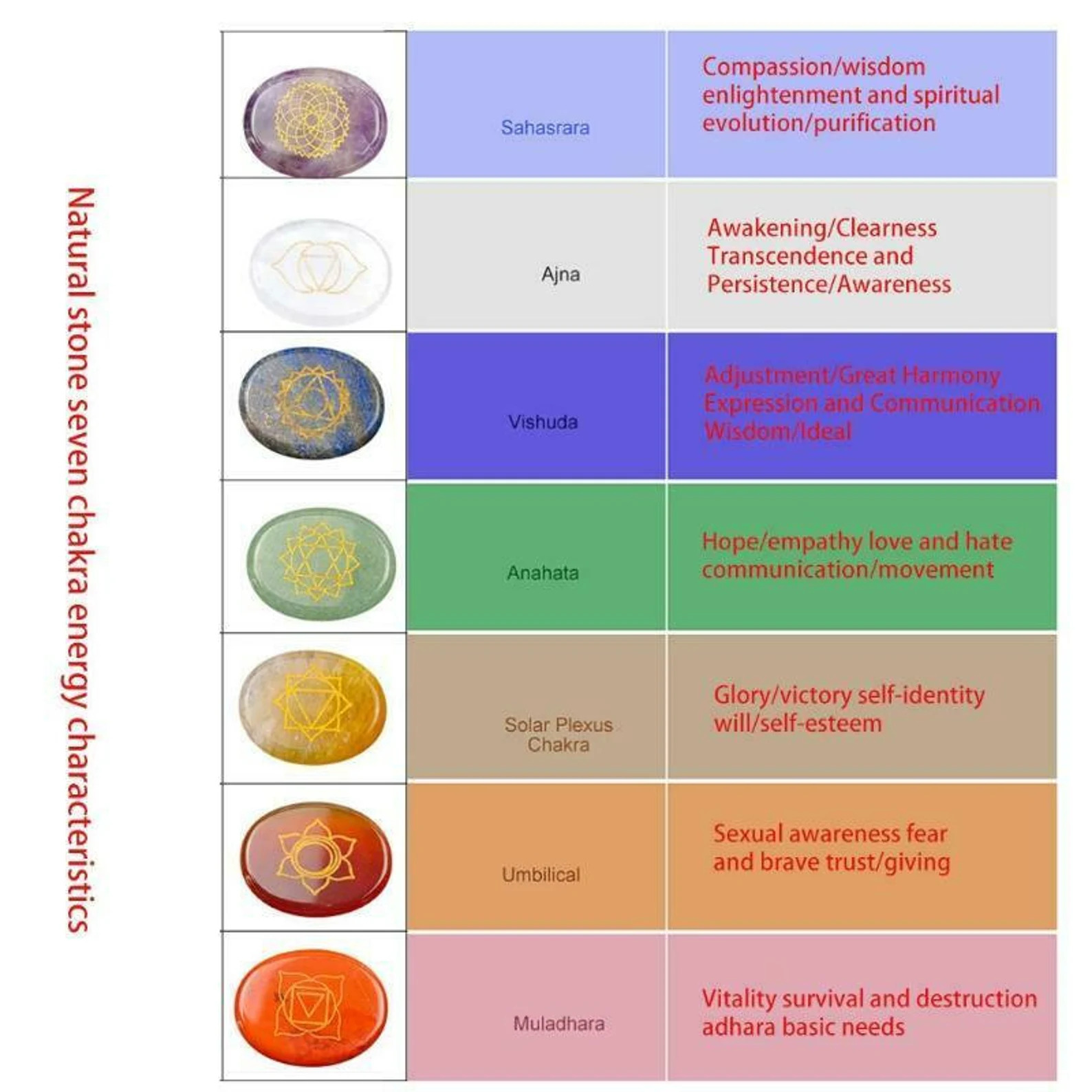 Seven Chakra Stones aid in maintaining the proper energy levels of the seven Chakras, resulting in the wearer feeling more balanced overall. When you concentrate on maintaining the chakras open and replacing negative thoughts with an optimistic attitude on life, the task becomes more achievable.