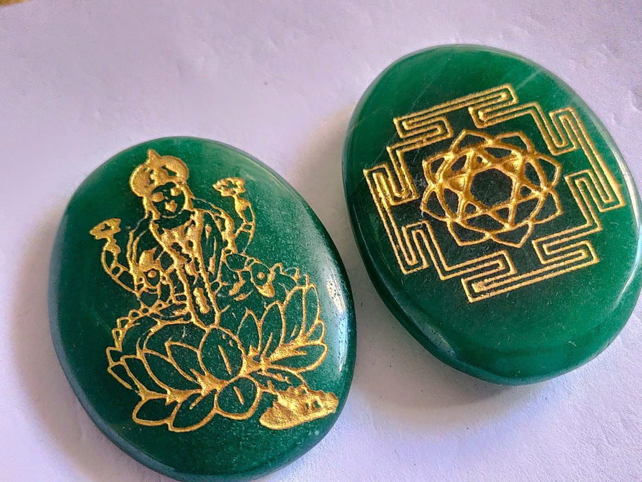 Elevate your spiritual journey and bring abundance and prosperity into your life with our exquisite Shri Yantra and Goddess Laxmi Picture on Green Jade Stone. Crafted with precision and devotion, this stunning piece combines the mystical power of the Shri Yantra and the divine blessings of Goddess Laxmi, all embedded on a high-quality green jade stone. This unique spiritual artifact is designed to not only enhance the aesthetic beauty of your space but also infuse it with positive energy and blessings.