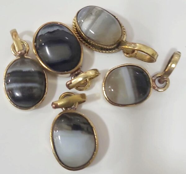 The Sulemani Hakik Stone Pendant is made from natural Sulemani Hakik, a powerful form of Agate stone revered for its strong grounding and protective qualities. This unique gemstone features natural bands in shades of black, grey, and white — a signature identity of authentic Sulemani Hakik. Encased in an elegant metal frame (gold-tone finish), each pendant carries distinct energy and visual appeal, making it a beautiful spiritual accessory for everyday wear.
