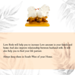 A Vastu Feng Shui Pair of Love Birds is considered as a symbol of love and romance. Love birds can be kept in South-West corner of the house or else of bedroom because this corner is considered as the harbinger of love and romance. This shall improve your love life. Placing Love Birds improves love life. Gives you strength of devotion and romantic bliss. Not only will your reputation be enhanced over the years but also you will achieve recognition and attain great success in your chosen profession. Keeping Love Birds in your house will form a strong attachment between partners.